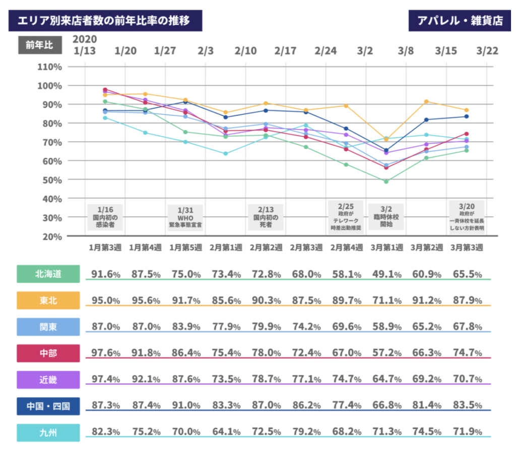 全国的に来店者数の落ち込みに回復の兆しが見えてきたことは、小売・アパレル企業の皆さまにとっては朗報になるかと思います。ですが、新型コロナウイルスへの警戒をゆるめることができる状況では依然としてありません。3月19日、政府の新型コロナウイルス感染症対策専門家会議で「地域の実状に応じた対策の必要性がある」との見解が示されました。