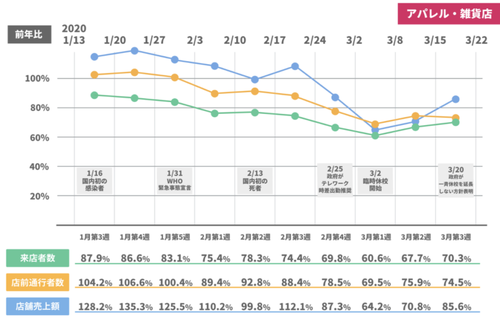 店舗内に設置されたカメラやセンサーから来店者の情報を把握、新型コロナウイルスの国内初の感染者が確認された1月第3週(13日ー19日)から3月第2週(16-22日)の「来店者数」「店前通行者数」(※)「店舗売上額」(※)の推移を検証。具体的には3つの指標の1週間(月曜~日曜)の平均値を算出、前年同時期と比べました。また、エリア別、店舗形態別でも同様に比べました。