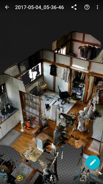 また、Matterport Scenes というアプリで複数の部屋をスキャンし、部屋を俯瞰するように表示したものを下記に示します。従来技術でも通常のカメラ画像のみを用いてこのような画像を作ることはできましたが、計算に数時間かかったり、撮影の仕方に工夫が必要だったりなどの課題がありました。「ZenFone AR」ではリアルタイムにプレビューしながらこのようなデータが容易に取得できることが確認できました。なお、対象物の色や表面の反射具合によりスキャンのしやすさは異なります。白い対象物であれば、2~4m、黒い対象物であれば1m程度まで近づく必要がありました。